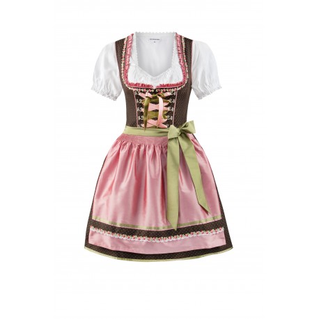 Das zweiteilige MiniDirndl Patty hat einen brauen Grundton mit kleinen hellen Punkten.